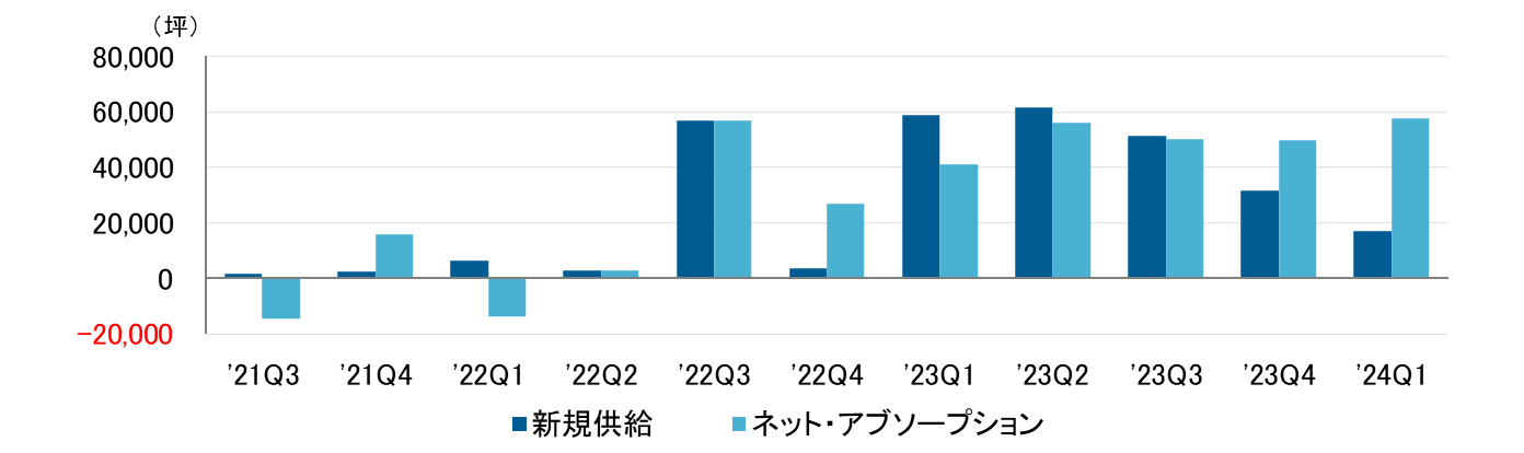 ネット・アブソープション(吸収需要)はオフィス需要の指標であり、一定期間におけるテナント入居面積(稼働面積)の増減を表す。2023年第1~第3四半期は、都心部の大量供給を背景に供給が需要を上回る供給過剰となったが、その後は2期連続で需要が供給を上回る需要超過となっている。