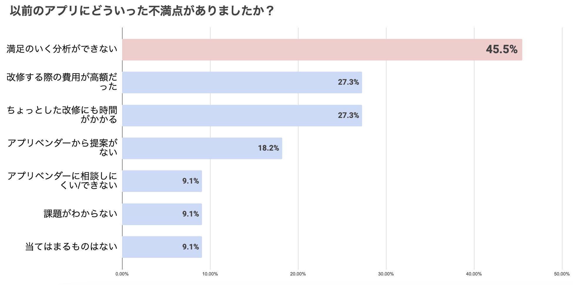 金銭や時間のコストについてはある程度想定していましたが、ベンダーとのコミュニケーションも不満にあがりやすいポイントであることから、高度な分析が可能で柔軟性と拡張性があり、サポート体制が充実したアプリベンダーが求められていると考えられます。