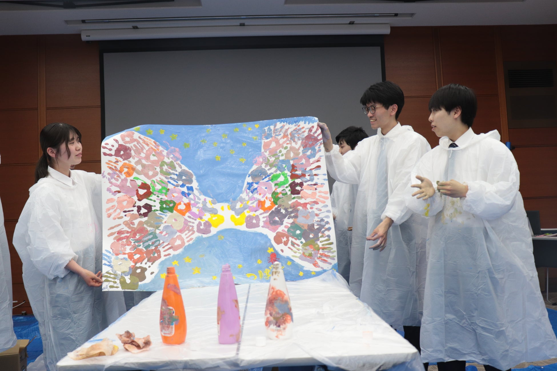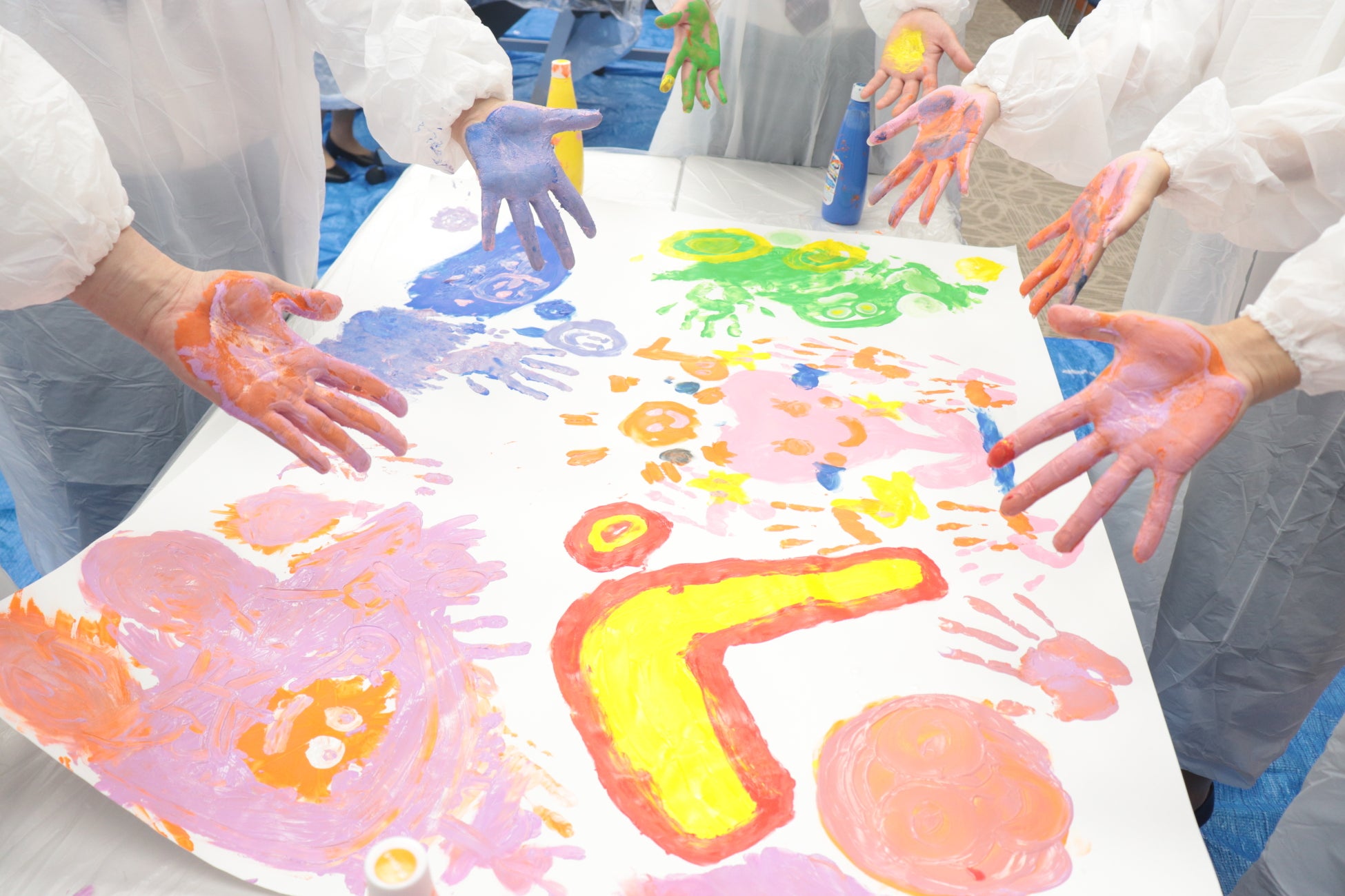 ゆびえのぐに触れる機会は、入社式のこの日が初めてという新入社員がほとんどで、ゆびえのぐの新鮮な感覚を楽しんでいた様子でした。絵の具をたっぷりと出して豪快に混ぜ広げたり、マヨネーズのような容器に入ったゆびえのぐを大胆に紙や手のひらに出したり、リズムよくたたいて塗り広げたり、ゆびえのぐを削り取ったり、試行錯誤する姿が見受けられ、ゆびえのぐは、合計で約80本分(約50kg)が使用されました。