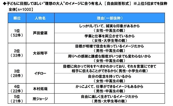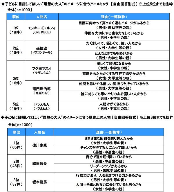 全回答者(1,000名)に、自分の子どもに目指してほしい“理想の大人”のイメージに合う有名人やアニメキャラ、歴史上の人物について聞きました。