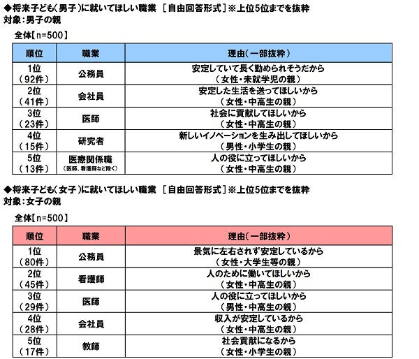 ・自分の子どもに就いてほしい職業 男子・女子の親ともに1位は「公務員」