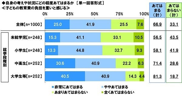 ◆「子どもの教育費の負担を重いと感じる」親の6割半、大学生等の親では8割強