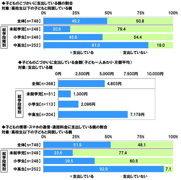 高校生以下の子どもと同居している親(748名)に、子どものこづかいや、携帯電話・スマートフォンの通信・通話料金への支出状況について聞きました。 子どもの≪こづかい≫に支出している親の割合を子どもの就学段階別にみると、未就学児の親では20.6%、小学生の親では45.6%、中高生の親では81.0%でした。 (図13)