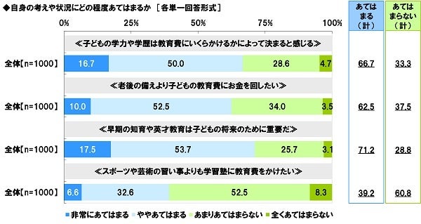 大学生以下の子どもがいる20歳以上の男女1,000名(全回答者)に、子どもの教育や教育費に関する内容について、自身の考えや状況がどの程度あてはまるか聞きました。