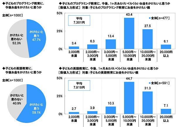 ◆「子どものプログラミング教育にお金をかけたい」親の約5割、かけたいと思う金額は平均7,301円/月