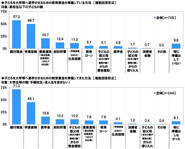 ◆子どもを大学等へ進学させるための教育資金の準備方法 1位「銀行預金」2位「学資保険」