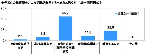また、子どもの教育費をいつまで親が負担するべきだと思うか聞いたところ、「大学・短大・専門学校卒業まで」が55.7%と突出して高くなり、「就職するまで」が22.6%、「大学院卒業まで」が11.0%、「高校卒業まで」が8.2%、「義務教育終了まで」が2.5%となりました。 (図3)