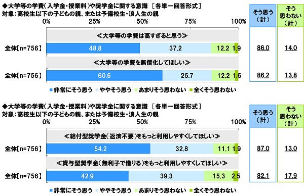 ◆「大学等の学費は高すぎる」高校生以下・浪人生の親の8割半