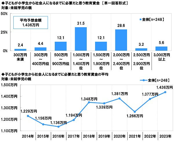 ◆小学生から社会人になるまでに必要な教育資金 平均予想金額は1,436万円、調査開始以来最高額に