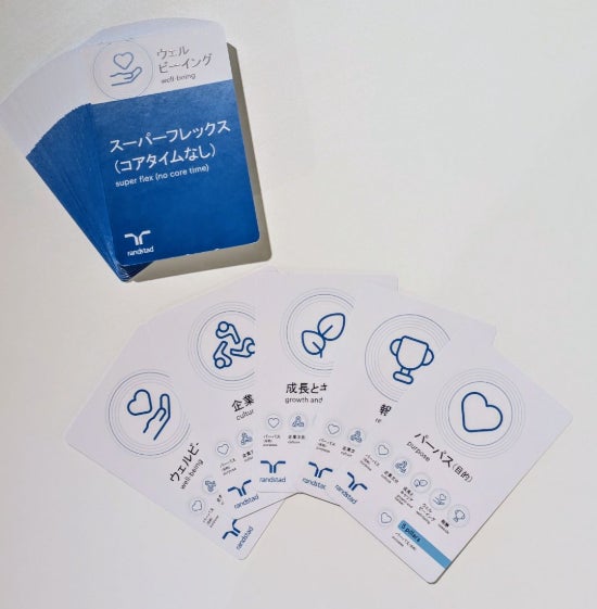 EVPカードゲームはランスタッド日本法人が独自に企画制作したもので、ランスタッドがEVPの柱としている5つのテーマ:「パーパス(目的)」、「企業文化」、「成長とキャリア」、「ウェルビーイング」、「報酬」とそれぞれの施策が日英両語で書かれた54枚のカードで構成されています。このEVPカードを北海道から九州まで国内全94拠点の各チームに配布したほか、オンラインでも楽しめるようデジタル版も用意しています。カードゲームを楽しみながら、企業文化や自身の価値観について考え、またチームメイトの大切にしていることについて理解を深めることで、チームビルディングに役立てます。