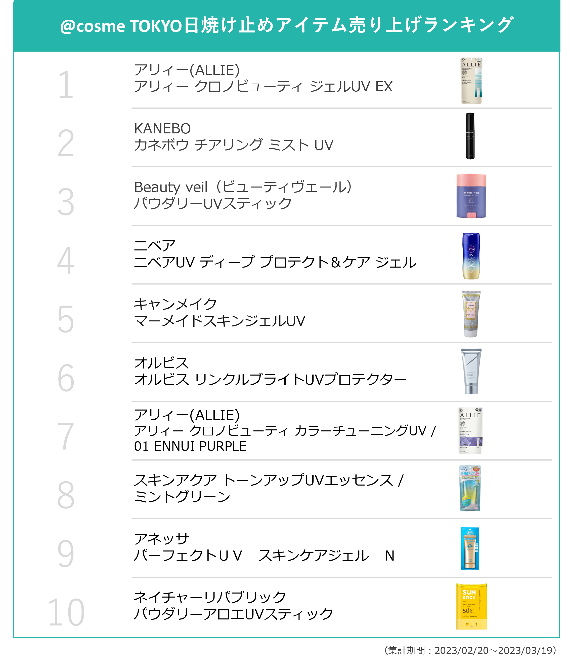 2.@cosme TOKYO日焼け止めアイテム売り上げランキング(集計期間:2023/02/20~2023/03/19)