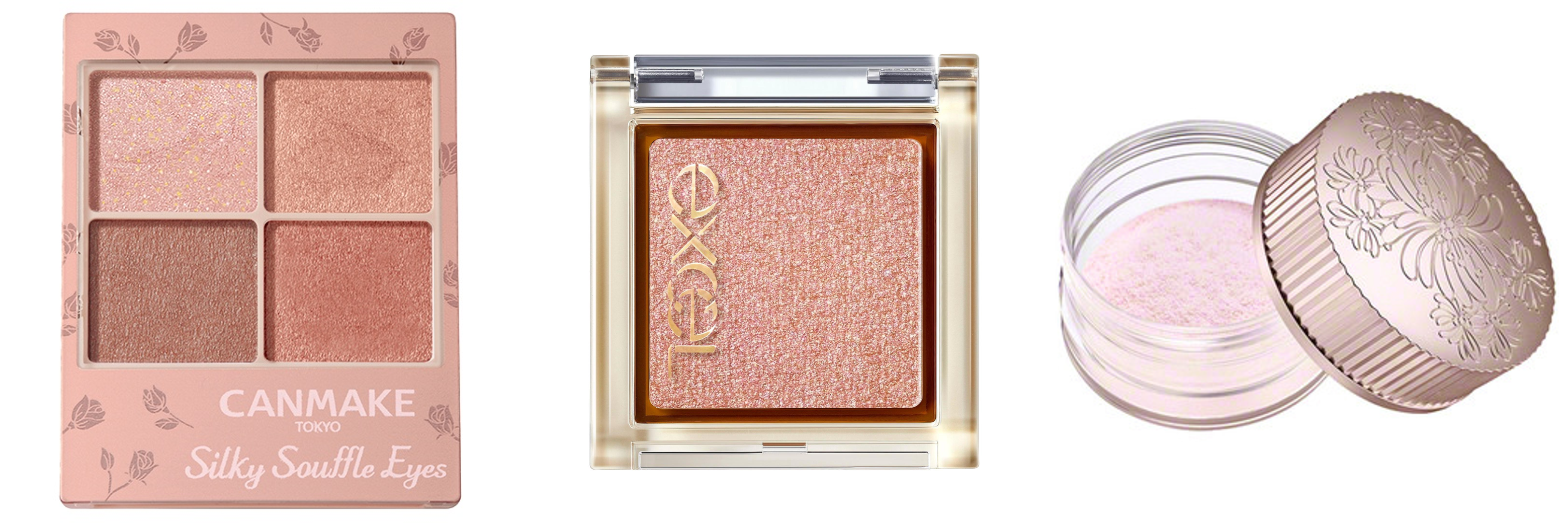 チークは透明感のあるライラックカラーをニュアンス程度に仕込む。密度の高いパールやシルバーラメのハイライト、質感がしっとりしたハイライトで濡れたようなツヤ肌へ。