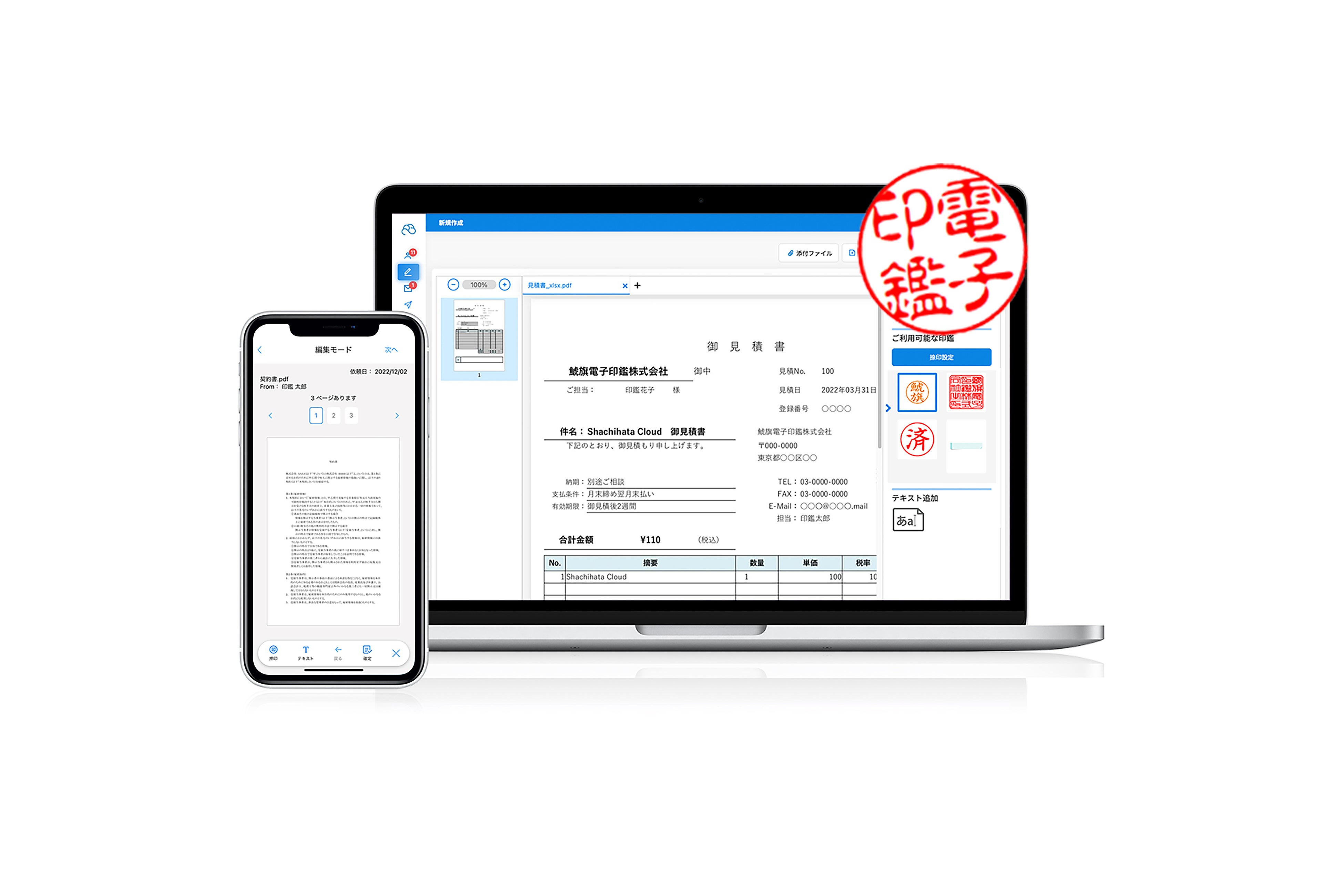 Shachihata Cloudは、リモートワーク時代のクラウド電子印鑑・電子署名サービスです。稟議書や申請書といった社内文書から、見積書や請求書、注文/請書等の取引先との決裁文書にいたるまで様々な文書の押印業務をデジタル化し、時間や場所を問わず簡単かつ安全に電子印鑑・電子署名を行うことができます。また、2022年には電子取引ソフトのJIIMA認証を取得しました。シヤチハタは電子印鑑システムの市場展開を1995年より行っており、導入数は2022年12月時点で95万件を突破しています。