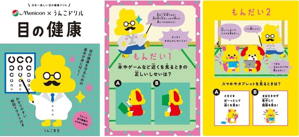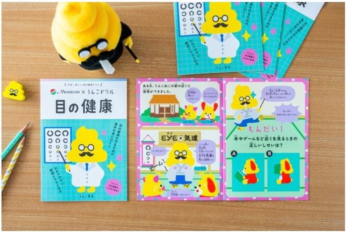 「うんこドリル“目の健康”」は、プロジェクト開始から2年でシリーズ累計500万部を突破した、楽しく遊びながら、生きていく上で必要な学びが得られる学習ドリル「うんこ啓発ドリル」シリーズとメニコンのコラボレーションにより制作した冊子となります。冊子にはうんこドリルシリーズのおなじみのキャラクター「うんこ先生」や「うんこねこ」と「うんこいぬ」が登場。内容はクイズ形式で全5問。親しみやすく可愛らしいイラストとテンポよく展開されるストーリーで子どもの興味を惹きつけながら、本やゲームを近くで見るときの正しい姿勢や、スマホやタブレットを見るときの注意点といった日常生活で気をつけるべきポイントをはじめ、万が一物が見えにくい場合や目が悪くなってしまった場合の対処法などについて学ぶことができます。
