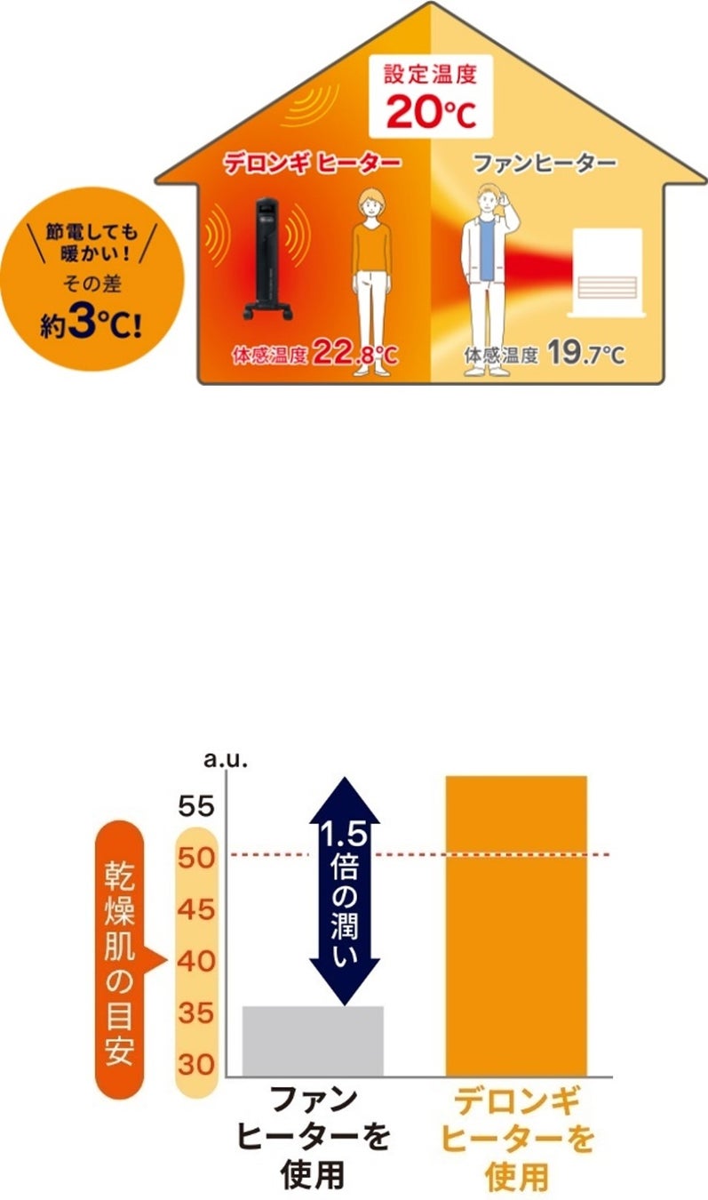 デロンギ ヒーターは輻射熱(太陽が地球に熱を伝えるのと同じ原理)で床・壁・天井にも熱を伝え、部屋中を暖めるから体感温度が違います。20℃設定でも部屋中快適です。