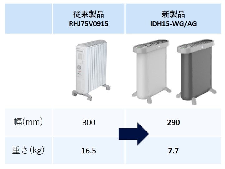 人間工学に基づくデザインでインテリアに調和しやすいシルエットを追求。使いやすさをさらに高めながら、従来のオイルヒーター※に比べて約50%以上もの軽量化を実現しました。