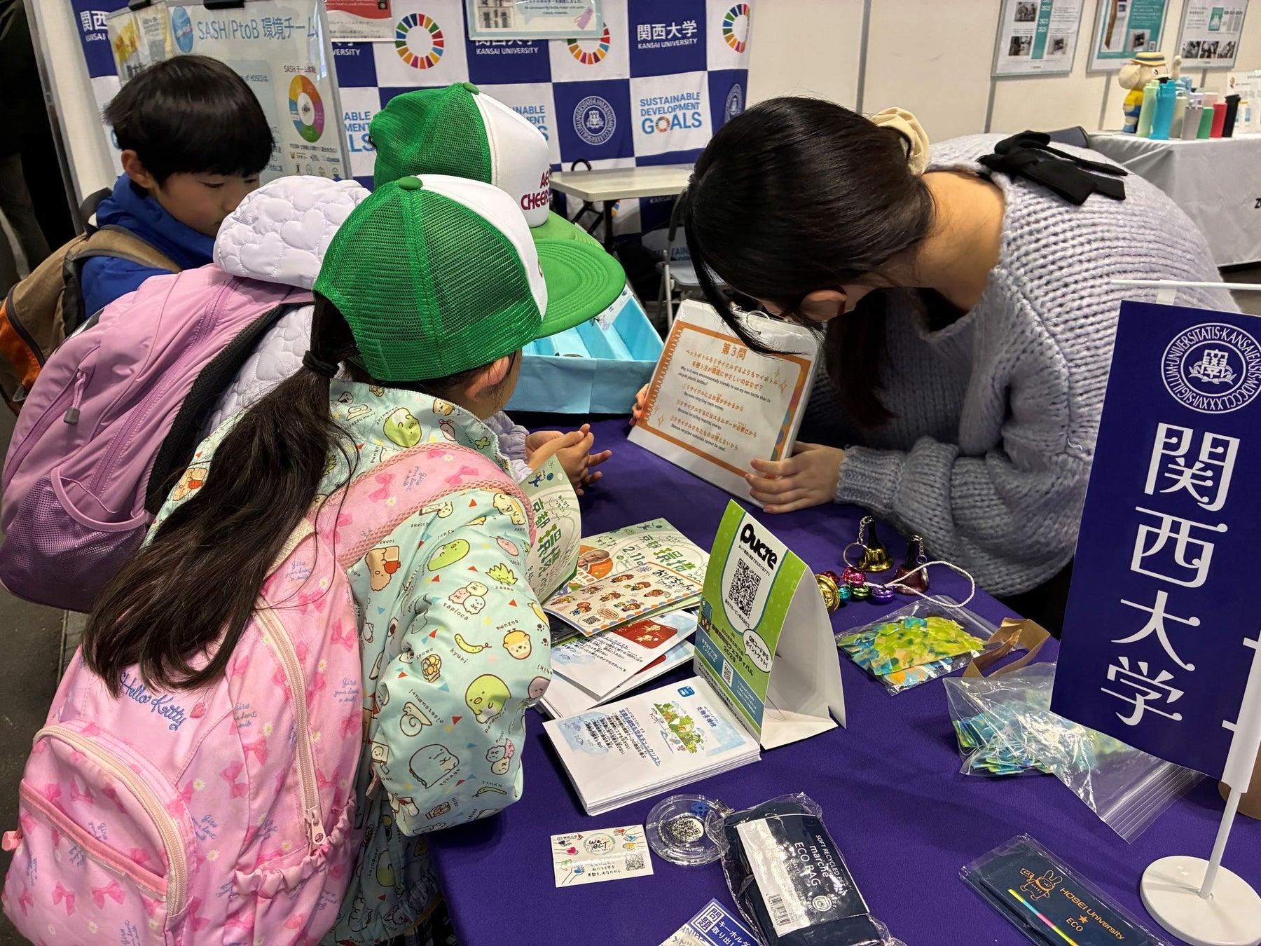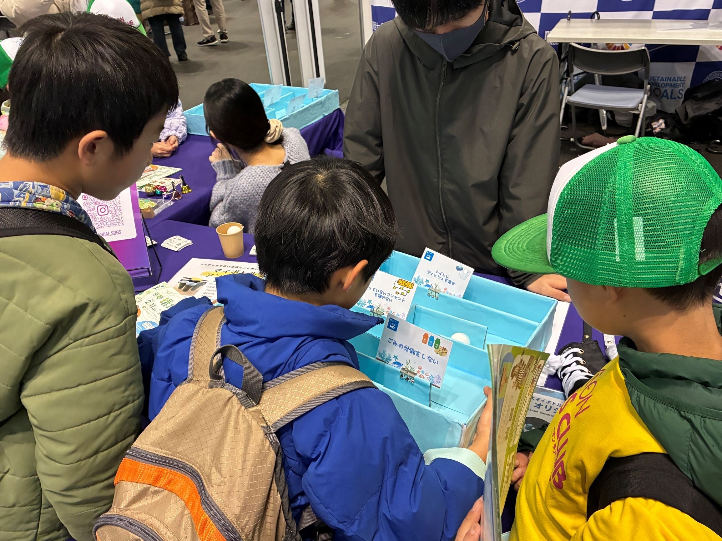象印マホービン、法政大学、中央大学との共同出展ブースに、関西大学「マイボトルアンバサダー」の学生たちが参加し、来場者にプロジェクトの活動紹介や他大学の連携について説明しました。また、SDGsが学べる「段ボール迷路」を実施し、子どもたちを中心に楽しみながら環境について考えるきっかけを提供しました。