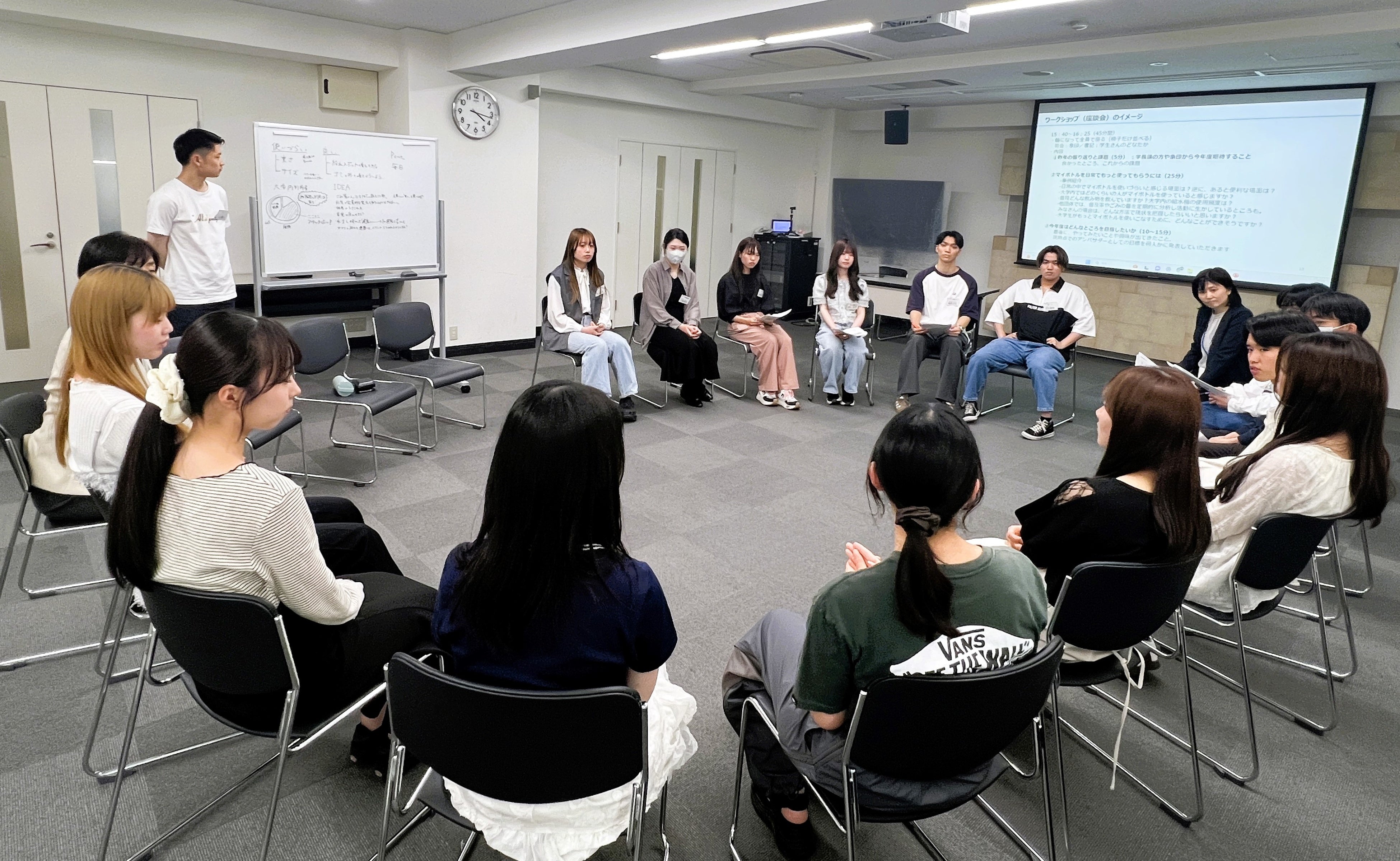 1年間の活動を振り返り、各自が成果や気づきについて発表しました。発表では「義務ではなく、楽しさや便利さを伝えることがマイボトル普及には大切だと実感した」という声が上がり、家族や友人など周囲に少しずつ変化が表れたことに喜びを感じる場面もありました。なお、所定の条件を満たした学生にはオープンバッジ(デジタル証明証)が付与されました。