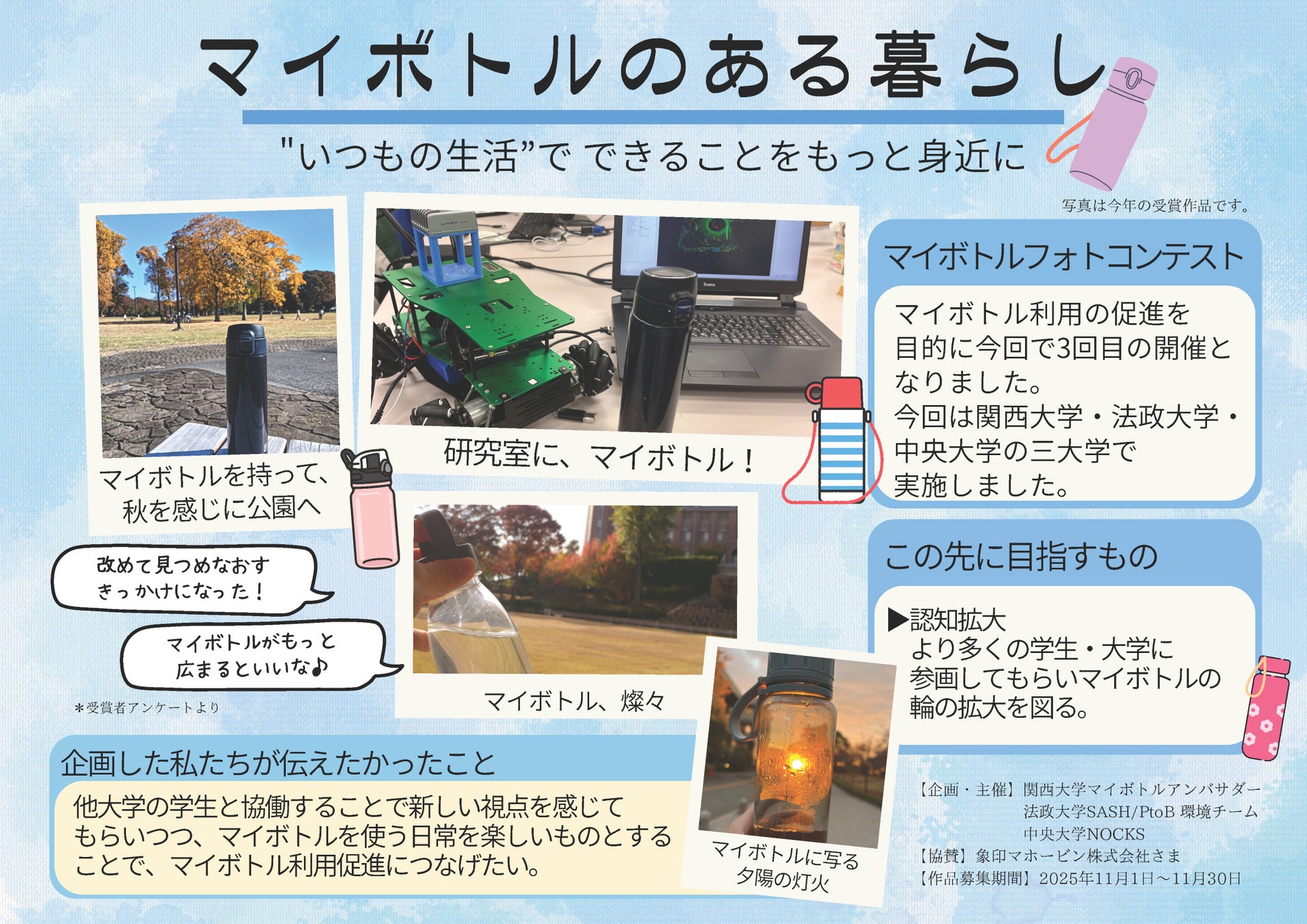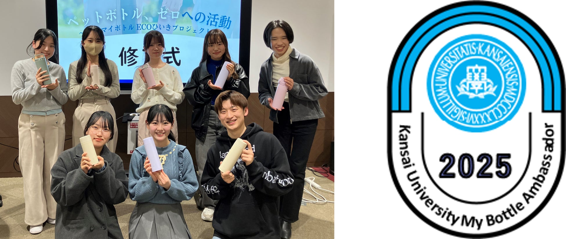 2024年5月より、両者によるマイボトル所持率の向上を目的とした取り組み「関大マイボトルアンバサダー『ECOひいきプロジェクト』」を開始しています。学生が中心になって発案したさまざまな企画を通じて、マイボトル所持者を「ECOひいき」する活動を学内外で積極的に展開しています。