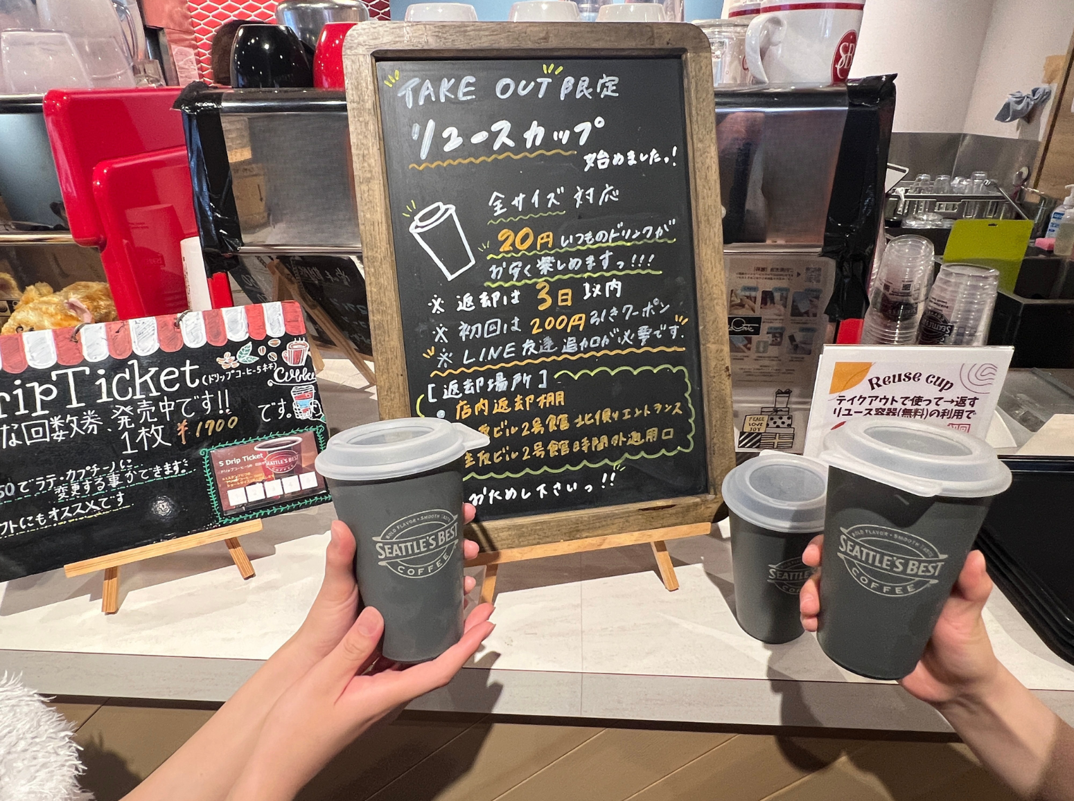 象印マホービンが取り組む「リユース容器シェアリングサービス」の実証実験(2025年10月末で終了)の協力店であったシアトルズベストコーヒー淀屋橋店を訪問し、本サービスを体験するとともに、大阪府の担当者やシアトルズベスト様より環境負荷低減に向けた取り組みについて講義をしていただきました。
