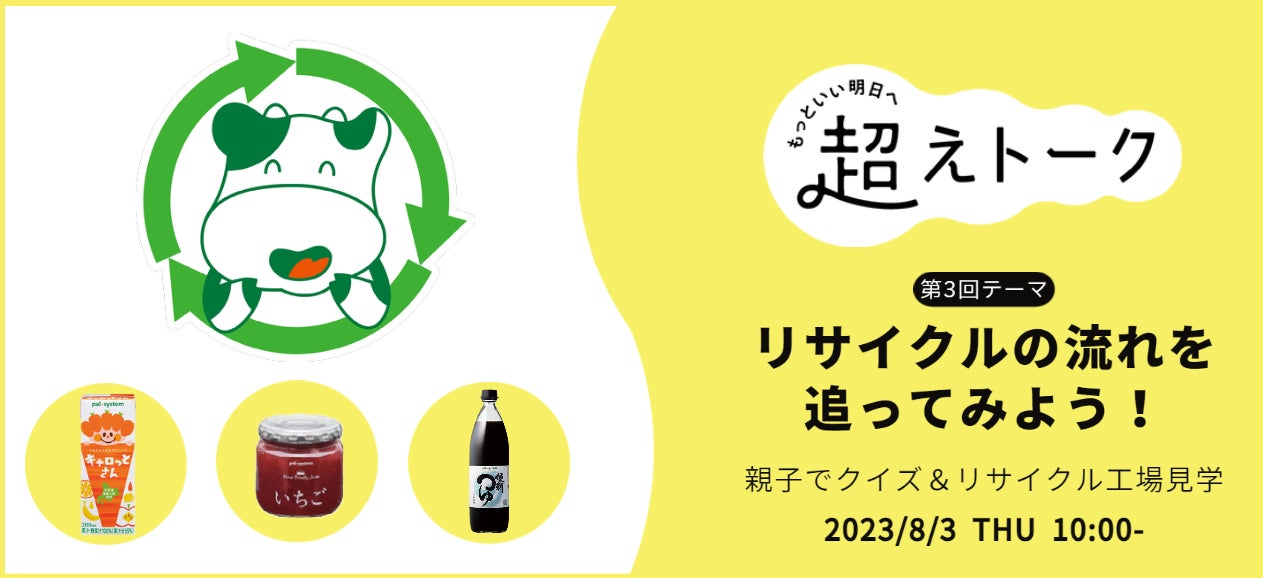 今回の超えトークは、『こんせんくんと一緒に「リサイクルの流れを追ってみよう!」親子でクイズ&リサイクル工場見学』をテーマに、2023年8月3日(木)にオンラインで開催します。パルシステムの商品について、「リサイクルクイズ」、「リサイクル工場見学」、「チャットでアイデア意見交換」を実施します。参加者には自由研究にも使える「リサイクルの流れを追ってみた!まとめシート」もプレゼントします。