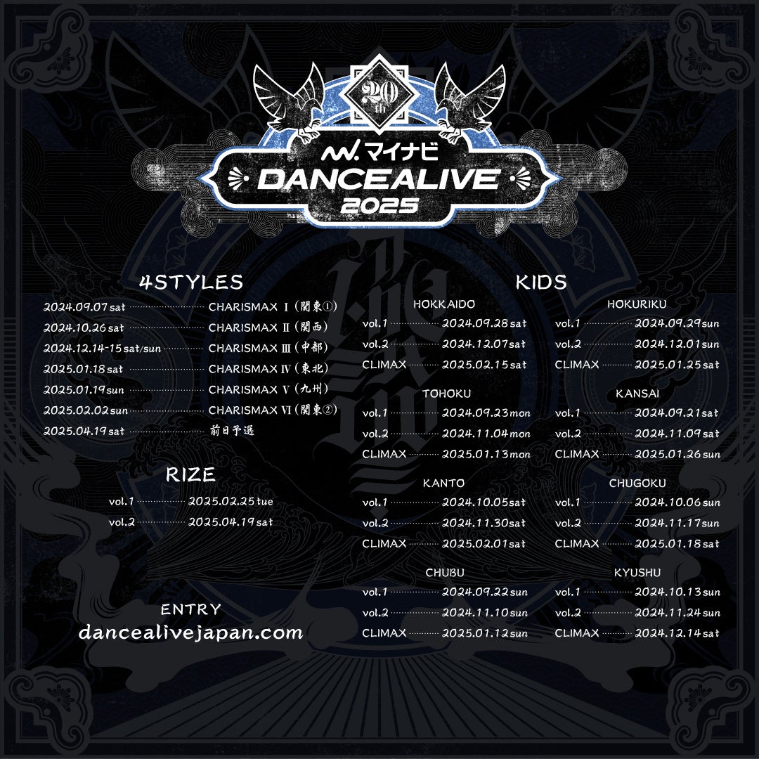 DANCEALIVE20周年となる今シーズンは、特別コンテンツをはじめ、昨年より開始した小学生ダンサー限定コンテンツ「KIDS vol.Ø」を関東関西で開催、通常予選ではルールを一部変更するなど、参加者の挑戦を後押しし、KIDSダンス界の更なる盛り上がり、未来のスター発掘を行ってまいります。