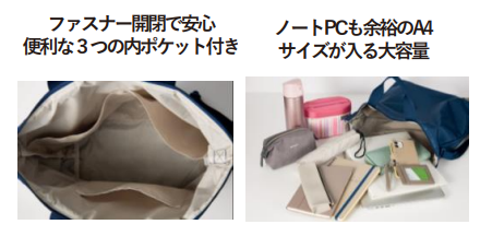 A4サイズが収納できる斜めがけOKの2WAYトート。シンプルなデザインだからこそ、オンもオフもシーンも問わず使いやすく、毎日大活躍します。