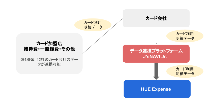 株式会社ワークスアプリケーションズ(本社:東京都千代田区、代表取締役最高経営責任者:秦修、以下 WAP)が提供する経費清算システム「HUE Expense」は、株式会社JTBビジネストラベルソリューションズ(本社:東京都江東区、代表取締役社長執行役員:原田雅裕、以下 JTBビジネストラベルソリューションズ)が提供する経費データ連携プラットフォーム「J'sNAVI Jr.」の「カード・決済データ連携サービス」に対応しました。これによってコーポレートカード利用明細の自動取込が可能なカード会社が大幅に増加しました。