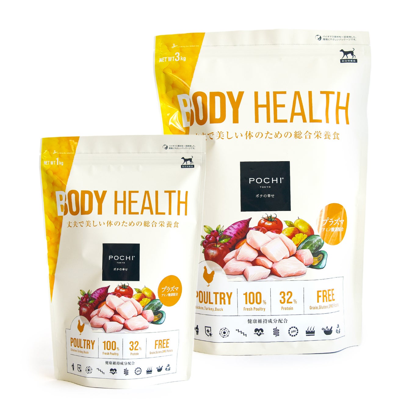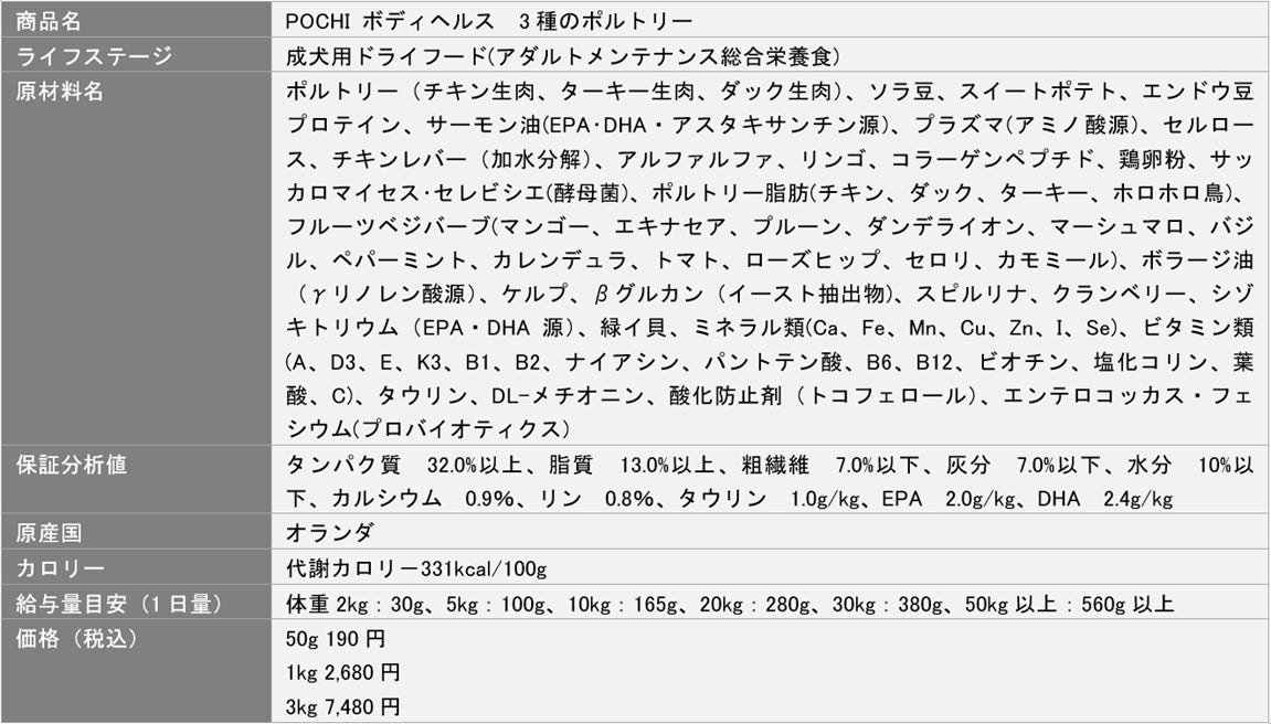 『POCHIボディヘルス シリーズ』は、「おいしさ」につながる生肉使用はそのままに、美しい体づくりのために、32%の高タンパク設計※、さらにプラズマ(アミノ酸源)、コラーゲンペプチドといった新しい原材料を使用した総合栄養食ドライフードです。今回、「3種のポルトリー」が追加となったことで、メインとなるタンパク源が異なる3種類(3種のポルトリー、ワイルドサーモン、ラム)となりました。いずれも、丈夫な体作りのためにプラズマ(アミノ酸源)配合の高タンパク設計とし、健康な皮膚被毛、毛ヅヤのためにコラーゲンペプチド、藻類(ケルプ、シゾキトリウム、スピルリナ)を配合しています。