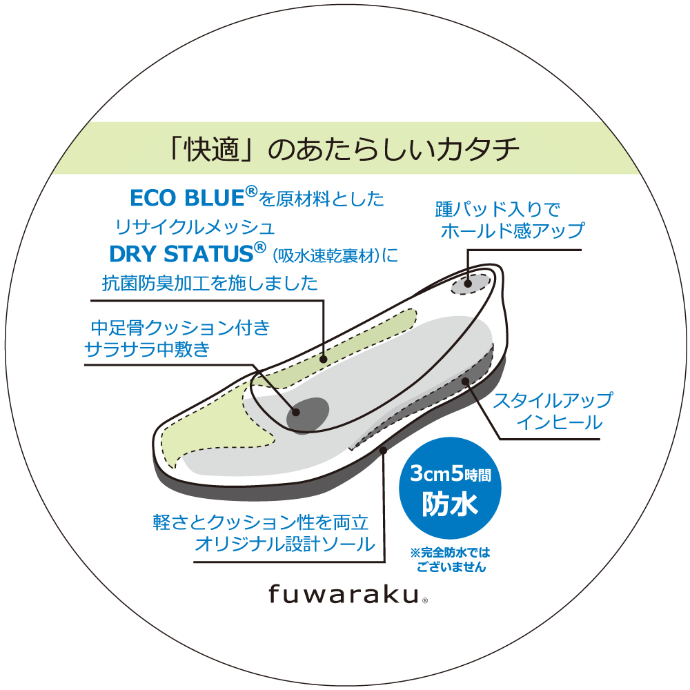 また、fuwarakuのスニーカーパンプス インヒールタイプには、靴内に環境に配慮した「ペットボトルリサイクル糸 ECO BLUE®」を原材料とした素材を使用しています。当社は、自然環境や社会活動のことを考えて、たとえ小さなアクションでも一歩ずつ、靴づくりを通してサステナブルな活動に取り組んでいます。足にも地球環境にもやさしい、fuwarakuのスニーカーパンプスの履き心地を是非体感してください。