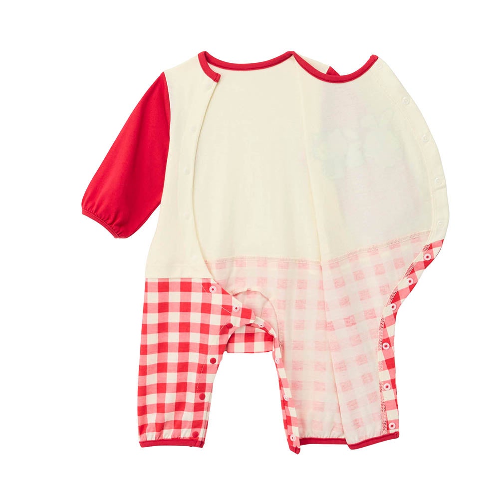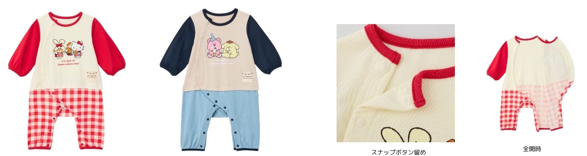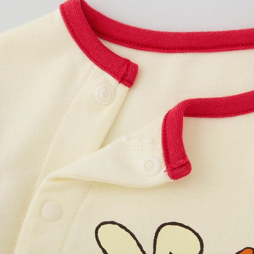 レイヤード風デザインのロンパースにキャラクターたちをプリントしました。ボトム部分は総柄プリントなので一枚でも可愛らしく着こなせます。着替えさせやすいように、スナップボタンで前側を簡単に開けられる仕様としています。また、両膝と股関節が曲がり、外側に開いたM字の形をしているベビー期独自の脚型にフィットするよう、ひざが外側に開いたボトムスパターンを採用することでベビーが動きやすく快適に過ごせるような工夫を施しました。