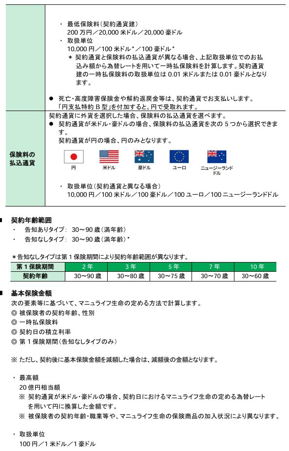 マニュライフ生命保険株式会社(取締役代表執行役社長兼CEO:ブノワ・メスレ、本社:東京都新宿区、以下「マニュライフ生命」)は、2025年4月1日(火)から、通貨選択型一時払終身保険『未来につなげる終身保険v2』を、株式会社福島銀行(取締役社長:加藤容啓、本店:福島県福島市、以下「福島銀行」)において販売開始いたします。
