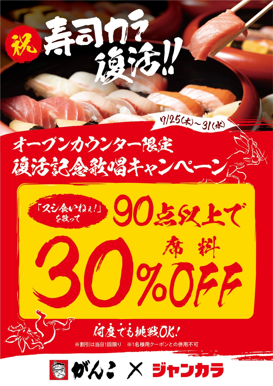 全国で180店舗を展開し、西日本においてカラオケチェーン業界最大規模を誇るジャンカラは、大阪府高槻市の高槻シースー店にて5月13日から販売休止していた人気商品「寿司カラ」を7月25日(木)より販売再開することをお知らせします。