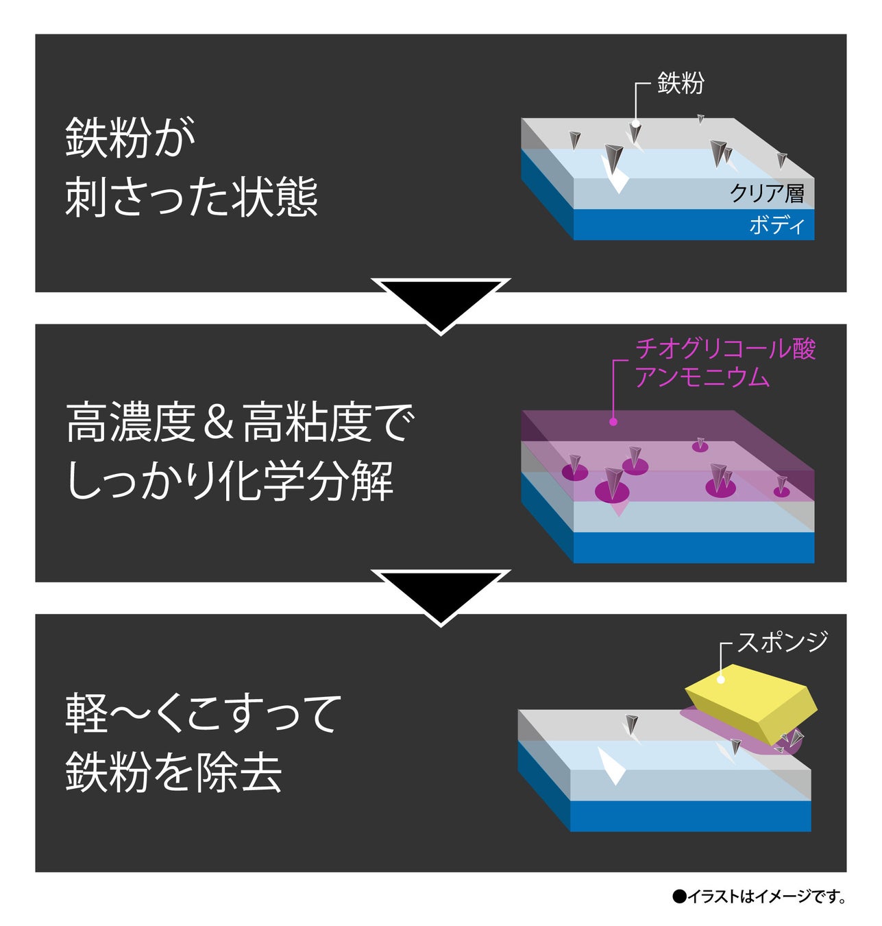 ボディの平らな面・縦の面どちらにも留まる高粘度処方で、高い鉄粉分解力を実現