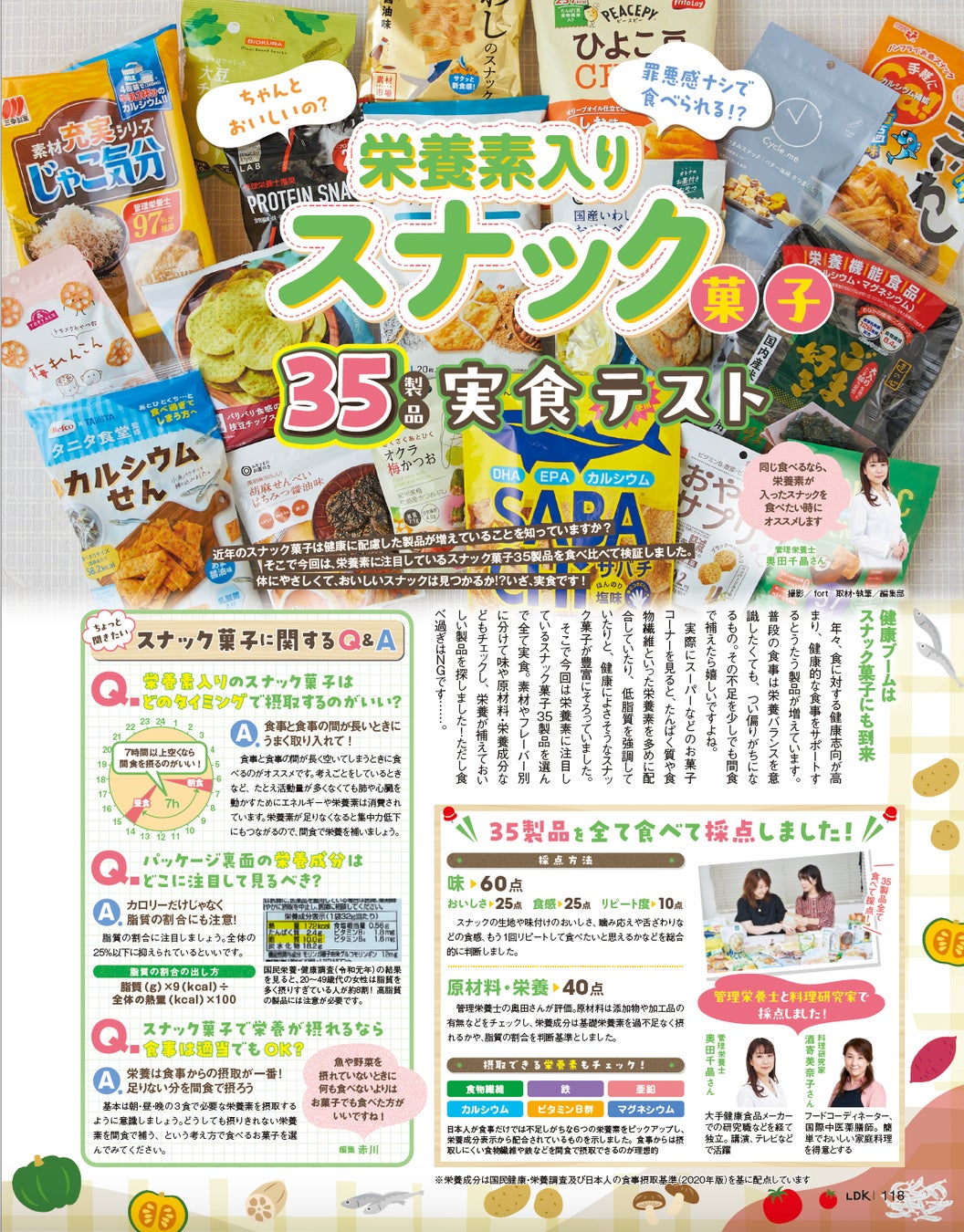 惜しくもTOP10入りしなかった栄養素入りスナック菓子・豆類、および野菜類・魚類・いもごま類の製検証結果は、発売中の『LDK』2024年12⽉号をチェック!