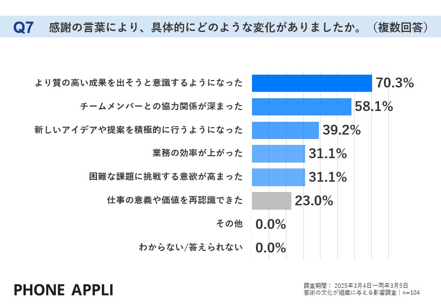 別の設問では、感謝の言葉をかけられた後、全体の80.4%が「仕事へのモチベーションが向上した」と回答しました。さらに、モチベーションが向上した人のうち70.3%が、具体的な変化として「より質の高い成果を出そうと意識するようになった」と答えており、感謝の言葉が個人のパフォーマンス意識にも好影響を与えることが示されました。