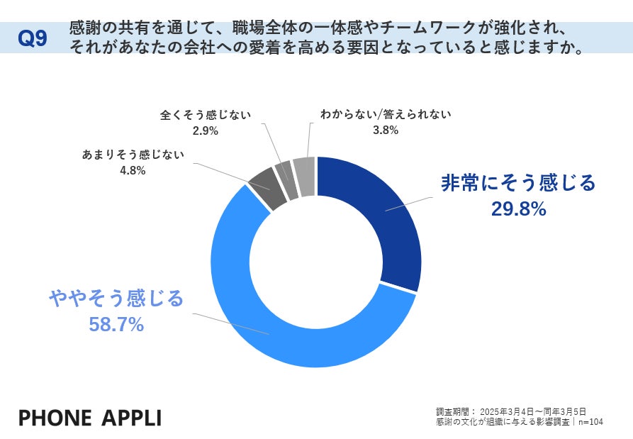 全体の88.5%が「感謝の共有を通じて、職場全体の一体感やチームワークが強化され、それが会社への愛着を高める要因となっている」と回答しました。