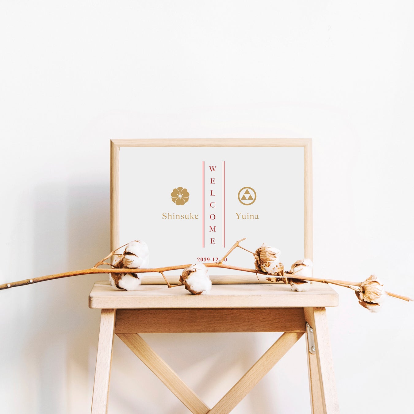 両家の家紋を組み合わせて仕立てる、格式とデザイン性を兼ね備えたウェルカムボード。和装や和婚スタイルの結婚式にぴったりの一枚です。