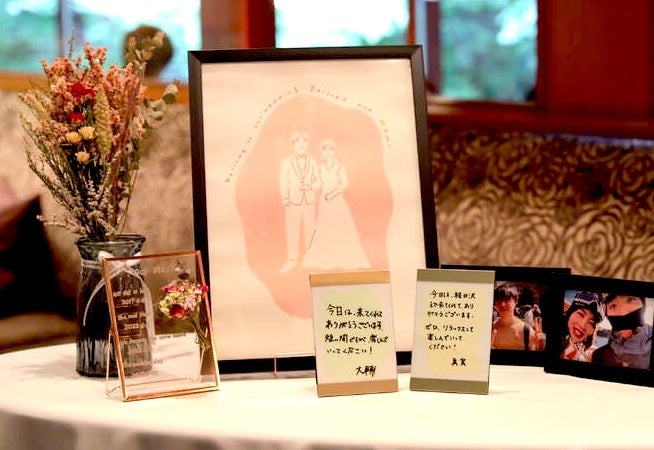 ポーズや表情まで自分たちらしく再現。似顔絵ウェルカムボード
