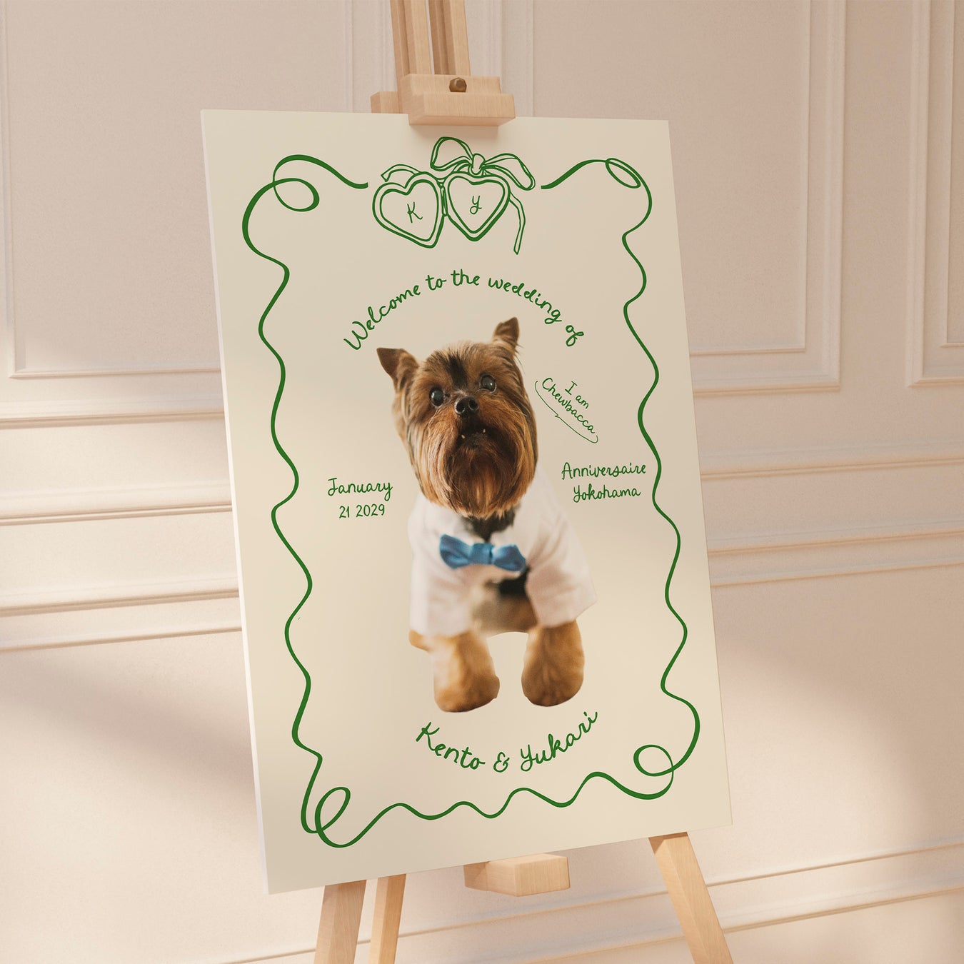 お気に入りのペット写真を、そのままおしゃれなウェルカムボードに仕立てるアイテム。家族の一員であるペットと一緒に迎える結婚式を演出できます。