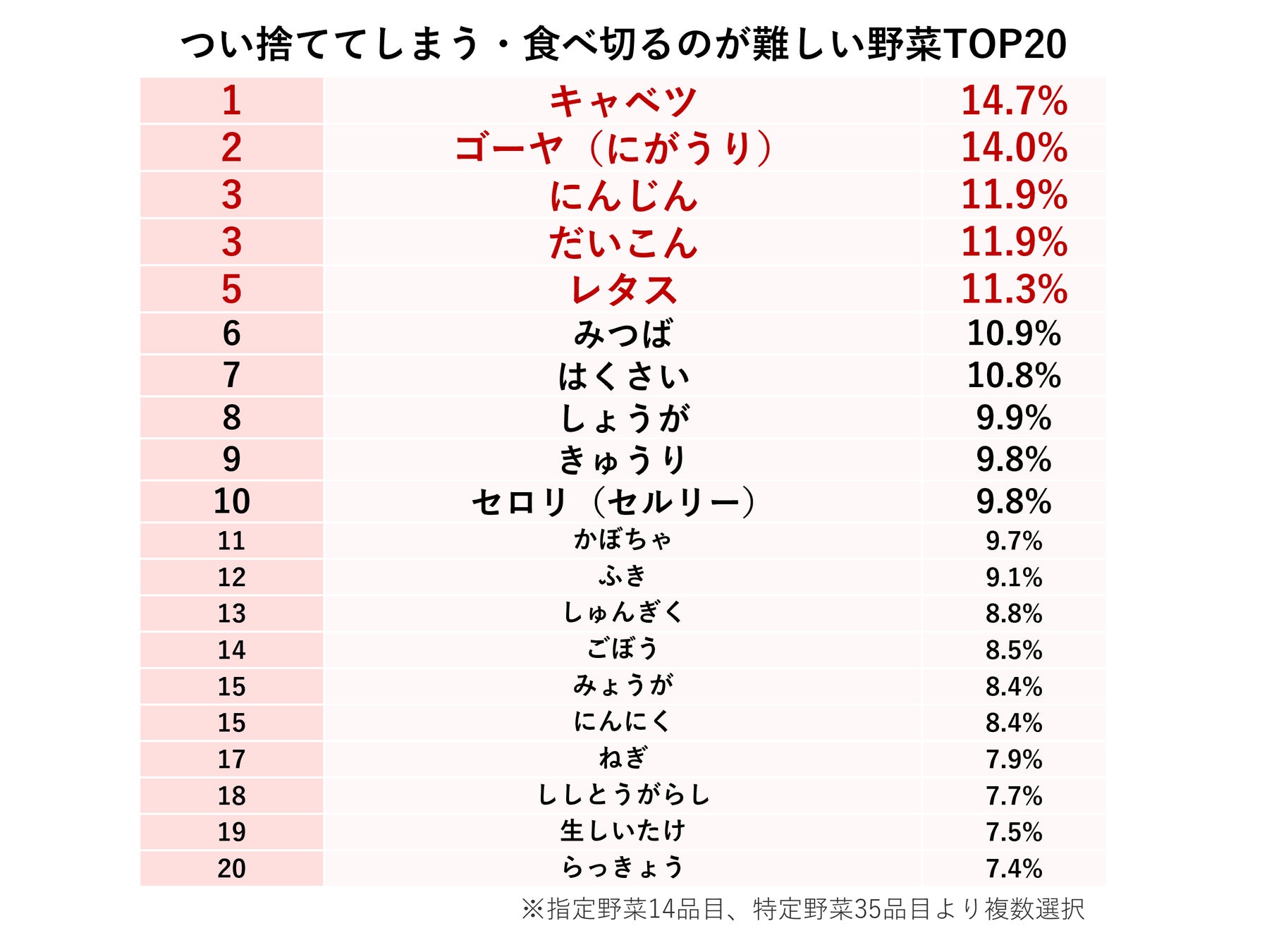 悔しかったエピソードにもあった通り、1つが大きいキャベツや大根、1袋に複数本が入っているにんじんは使い切ることが難しいと感じる人が多いようです。また2位の「ゴーヤ」は、6位の「みつば」10位「セロリ(セルリー)」と同様に、レシピが限られる印象が強いことからランクインしていると考えられます。