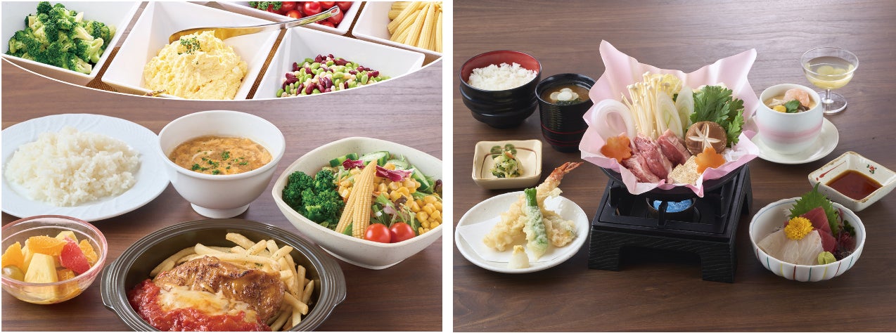 右:すき焼きや天ぷらなど、和食のご馳走がたっぷりの「千寿楼」レディース御膳