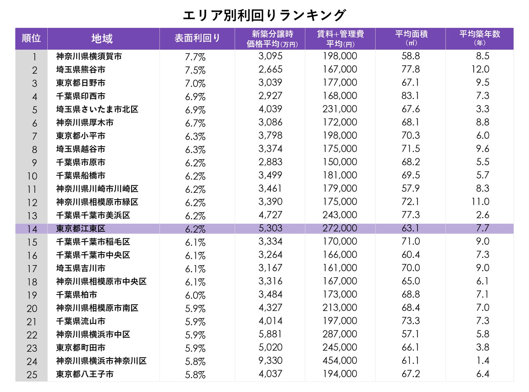 東京23区の最上位は江東区で、新築分譲時価格5,303万円に対し賃料が27万2,000円、利回り6.2%で14位でした。