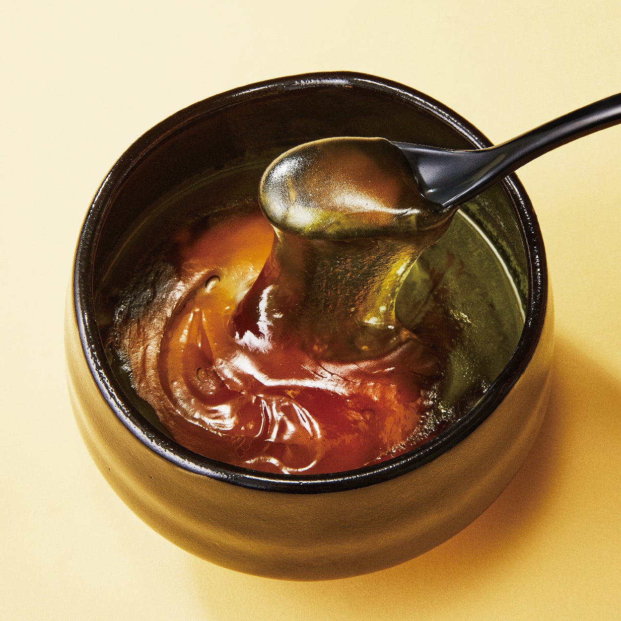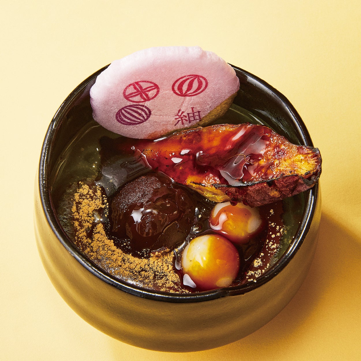 冬のティータイムにぴったりな和スイーツを楽しめるスイーツ膳です。抹茶ソースと焦がしきなこで楽しむ温かいわらび餅と台湾でポピュラーなスイーツ・豆花(トウファ)入りのお椀、紅はるかの焼き芋ブリュレ、粒あん、白玉、ふやきをご用意しました。ひとつひとつお召し上がりいただくことはもちろん、お好みのタイミングでお椀の中に入れて、ぜんざい風にお召し上がりいただくのもおすすめです。黒蜜をかけていただくと、味の変化をお楽しみいただけます。お口直しに、きゃらわさび※を添えました。