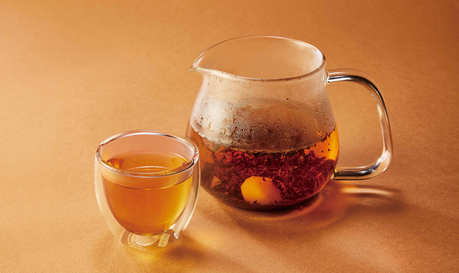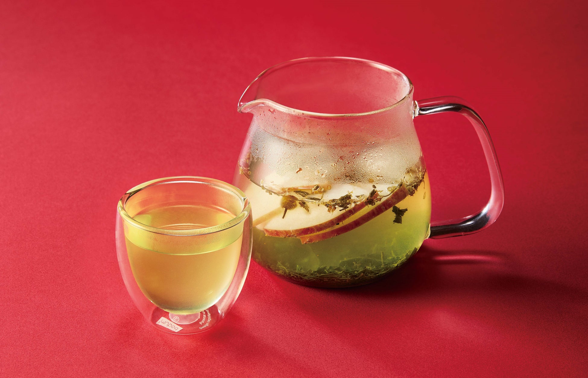 【冬季限定】はちみつ林檎とカモミールの煎茶:蜂蜜に漬に漬け込んだ林檎を入れて提供する、カモミールブレンドの煎茶です。やすらぎ感じる林檎の香りをお楽しみいただけます。