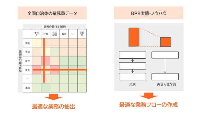 1.〔業務標準化モデル〕 ガバメイツが保有する「全庁業務量調査データ」から、業務分類(55種)×作業分類(38種)で類型化します。その中で標準化・共同化に適した業務(職員の業務負荷が高く、デジタル活用効果が高い業務)を抽出し、業務別に、最適な業務フローのモデルを作ります。さらに、最適な業務フローを実現するための各種ソリューション(システムやBPO)の最適な組み合わせをテンプレートとしてまとめます。これらを活用することで自治体は、業務時間の削減かつ費用対効果の高いシステムやBPOの導入が可能になります。