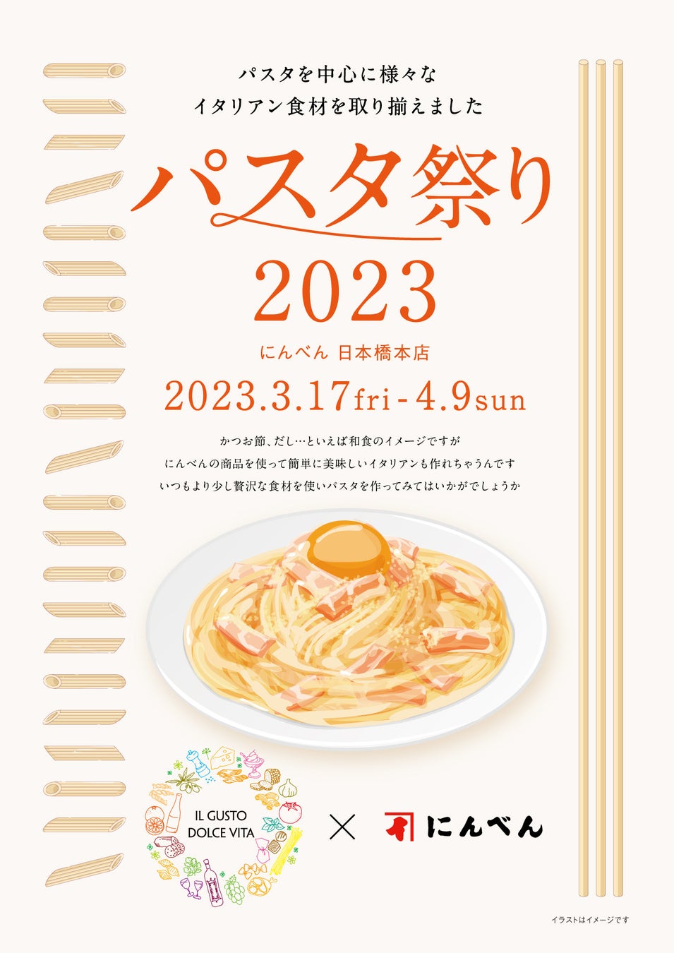 この度「にんべん 日本橋本店」で開催する「パスタ祭り」では、神楽坂のイタリアン食材店「神楽坂 il gusto Dolce Vita(神楽坂 イル グスト ドルチェ ヴィータ)」の選りすぐりのイタリアン食材や、イタリアンに相性抜群なにんべんのかつお節・だし商品をご用意します。さらに、Instagramフォロワー4.7万人の人気おうちパスタ研究家が考案した4種のパスタのレシピカードを無料配布します。かつお節・だし×イタリアン食材の美味しい融合をぜひお楽しみください。