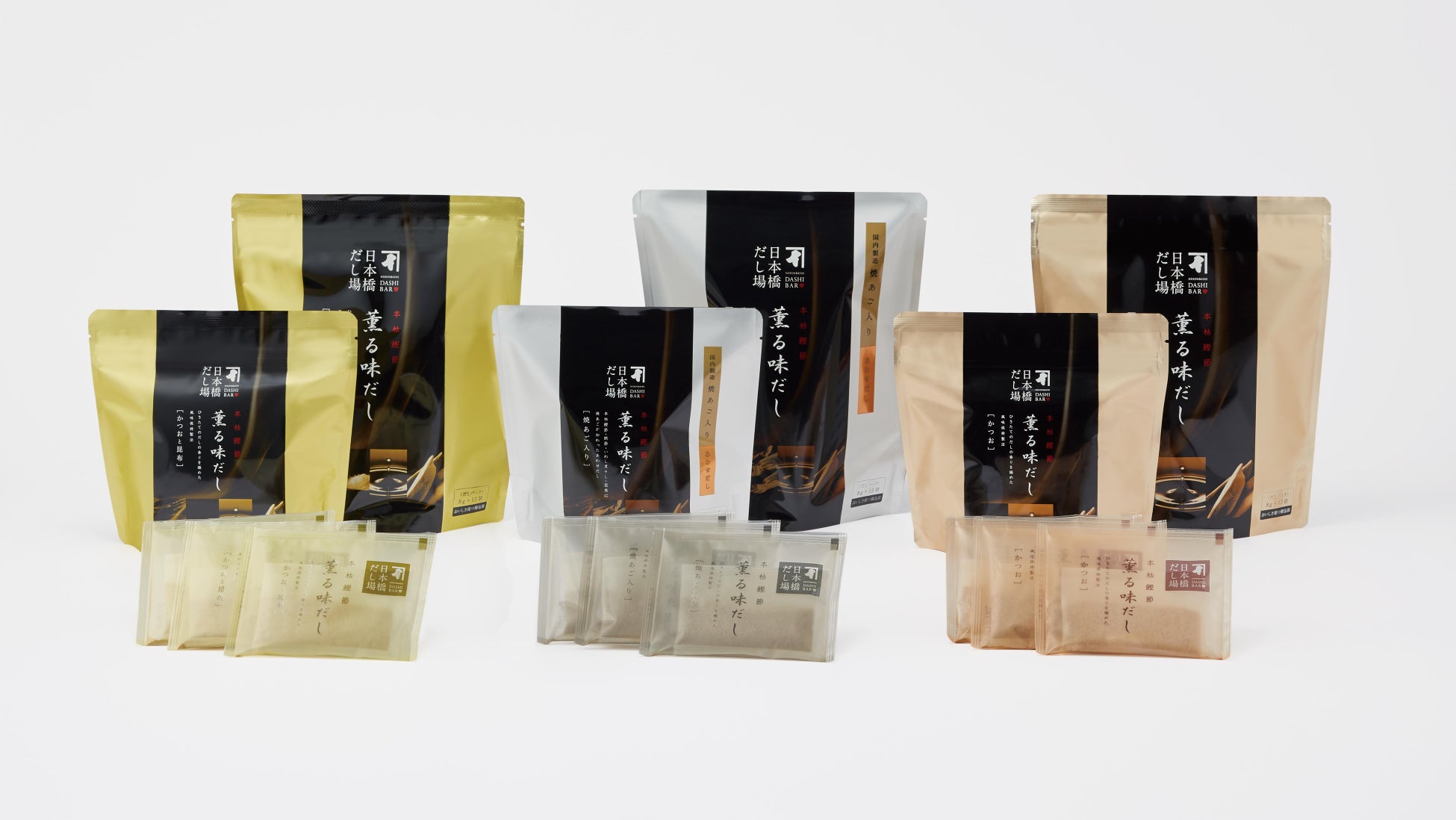 ひきたてのだし本来の香りと味わいをお楽しみいただける調味済だしパックです。素材になるべく熱をかけず、“かつお節の香りをとばさない”乾燥法により、だしをひいた時に漂う「ほっとするような、かつお節本来の優しい香り」を極めました。一つ一つ不活性ガス充てんをした個包装は、酸化を抑え、使う瞬間まで風味を保ちます。素材には、国内製造の“本枯鰹節”、芳醇な香りとうま味が特徴のプレミアム醤油“特選下総醤油”、だしとの相性がよい“クリスマス島の塩”などを使用し、シンプルに素材の美味しさを追求しました。化学調味料無添加です。