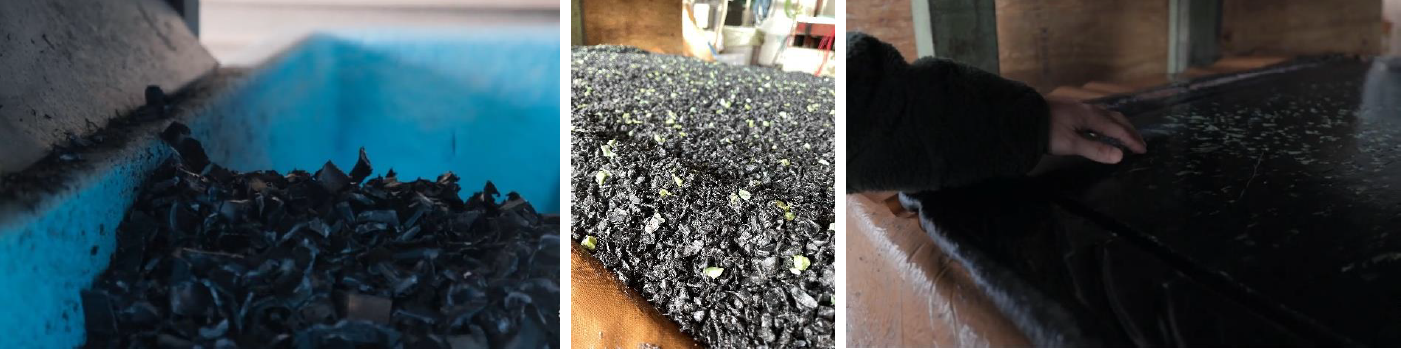 メインとなる板材の素材は、廃棄物として最も量が多い代表的な黒いブイを粉砕したチップに加え、ブランドネームにもある「グリーン」のチップをアクセントとして加えることで、素材の多様性も見せている。チップから板材に成型する特性を最大限にいかしたオンリーワンの素材となっている。