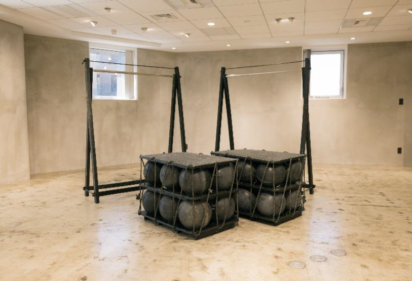 再生前の素材をダイレクトに伝えるために、ブイとロープをそのまま使用して構成した平台什器。球体のブイを並べて固定するためのフレームを、牡蠣の養殖で使用していたロープで編み込んで成立させている。